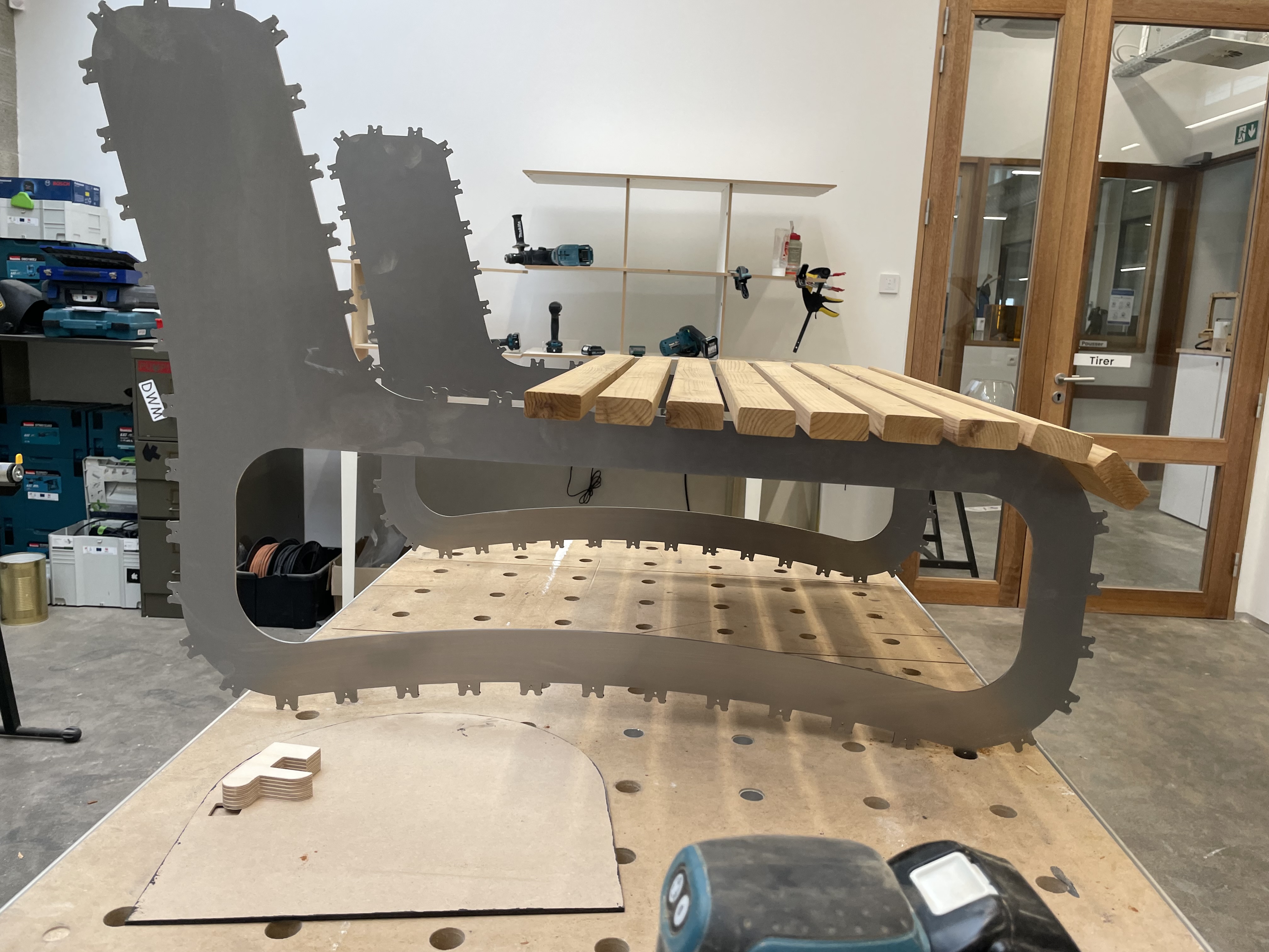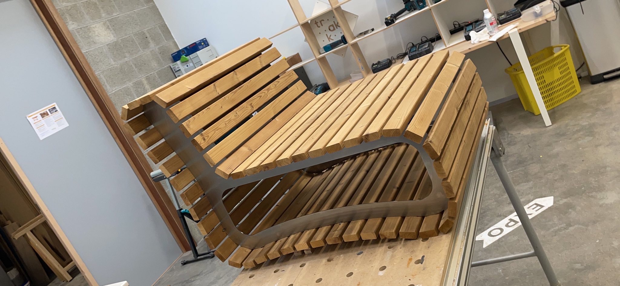 nos meubles ont tous la même structure : deux pièces parallèles pour le support et des dizaines de petites lattes pour consolider – de cette façon nos bancs/sièges/chaises sont costauds mais léger visuellement